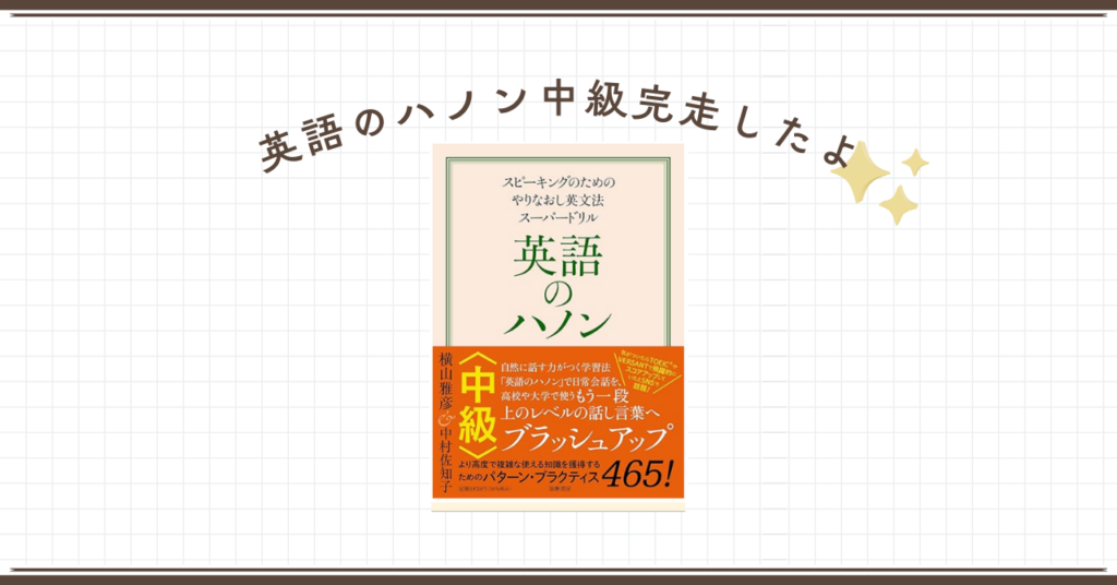去年からコツコツやってきた、英語のハノン!今週中級も終わった〜。めでたい。 英語のハノンは、考えなくても英語の構文が出てくるようになるドリル。初級、中級、上級と段階があり、順にやっていくことで英文法を一通り使えるようにするためのトレーニン... -