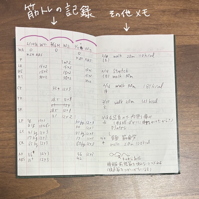体をうごかして変わっていく様子を可視化してみようと、ノートに記録するようになった。
