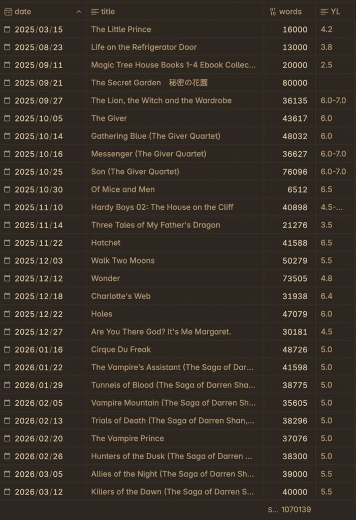 その後、エルマーの冒険や、ダレンシャンシリーズでガッツリ文字数を稼いで、楽しく100万語まで読み進められた。